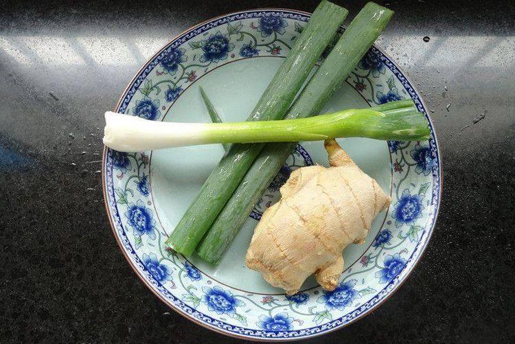 5. 将洗净的生姜、葱、青椒切小块装盘备用。