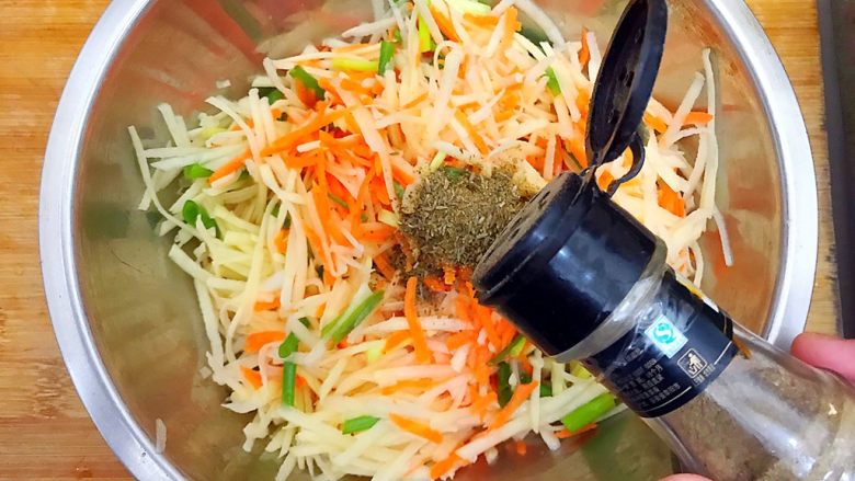8. 把土豆丝,胡萝卜丝,香葱全部倒入干净的大盆内!