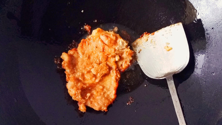 - 因为挂上粉浆原因,煎黄就反面。
