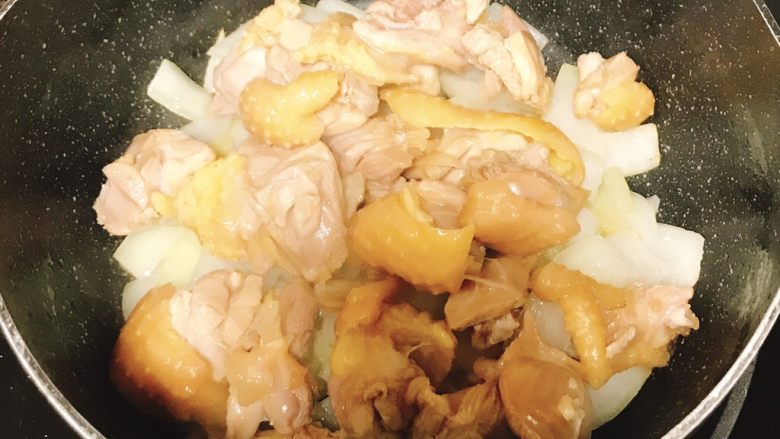 6. 洋葱变透明后加入鸡腿肉。 没有洋葱的看姜蒜的变色程度啊…