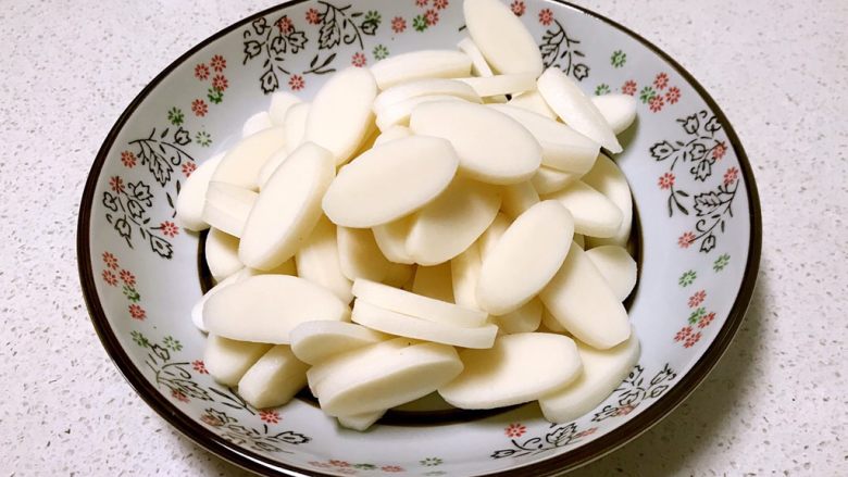 8. 把年糕切成小片,锅内加入冷水烧开后放入年糕,煮2分钟