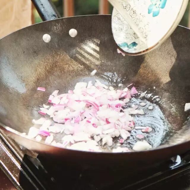 3. 将洋葱倒入锅中炒香