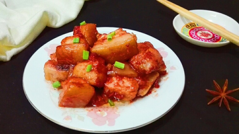 - 五花肉买靠近猪前腿部位,肉比较嫩,先冷水泡半个小时,冷水一起下锅烧开撇去浮沫,冲洗干净,冰糖小火熬到浅咖啡色,放姜片,葱白,五花肉,玫瑰腐乳汁一起中火烧开收汁。