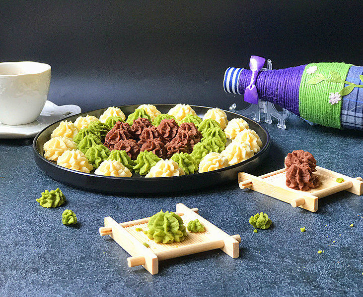 风靡网络和朋友圈,号称“吃一口就完全迷恋上”的曲奇饼干,曾经特别火、特别火。 火的令从来不赶时髦的我也痒痒了,正巧刚到了一台新烤箱,哈哈:不仅拔草了,还一次将三种颜色全部拔了,烘烤时守在烤箱旁,边观察边耐心等待它的出炉。 迫不及待地品尝了一个,终于知道为什么称之网红了;除奶香味十足外,更是入口即化、酥到掉渣,而且是酥到心碎的那种感觉,真的真的是:吃一口就完全迷恋上它了。 烤好后和那位分别品尝了一个后,其它的都没舍得吃;带了一半给好朋友,朋友尝过一个后立马收到包里了说:带回家给家里人吃;另外一半则留给儿子带到回单位路上吃,谁知那小子上了飞机后三下二下就给消灭了,还不忘告诉我说:等下次回来多做点,他要带给同事们炫耀炫耀~~~