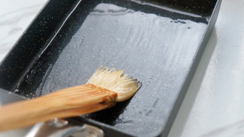 6. 取玉子烧专用煎锅,锅底薄薄地刷上一层食用油,小火加热。