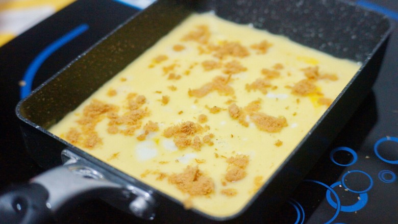 8. 小火加热至蛋液底部开始凝固时,在表层均匀地撒上适量肉松。