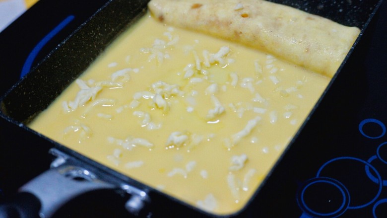 13. 加热至蛋液底部开始凝固时,在表层均匀地撒上适量芝士碎。