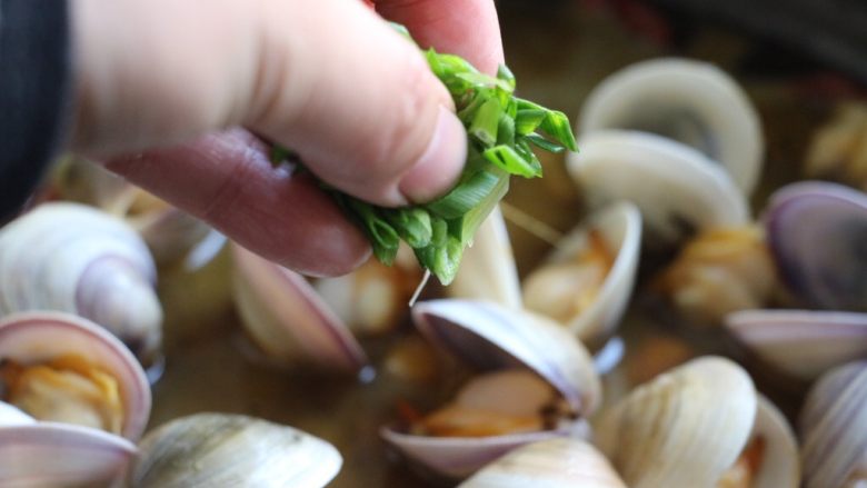 11. 文蛤八九成开囗就可撒上香葱熄火。出锅的过程余温会让所有文蛤开口熟了。