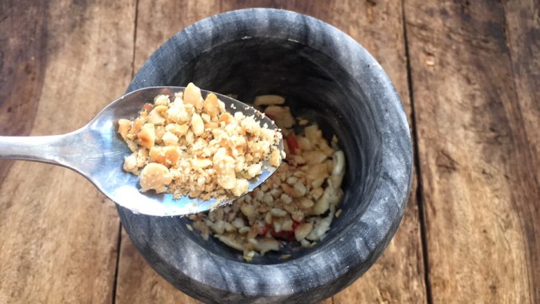 7. 花生碎其他菜还用到,我把它全部舀出来了,添加小米辣入舂中。