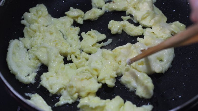 25. 中小火摊鸡蛋。用筷子把鸡蛋晃开成小块。