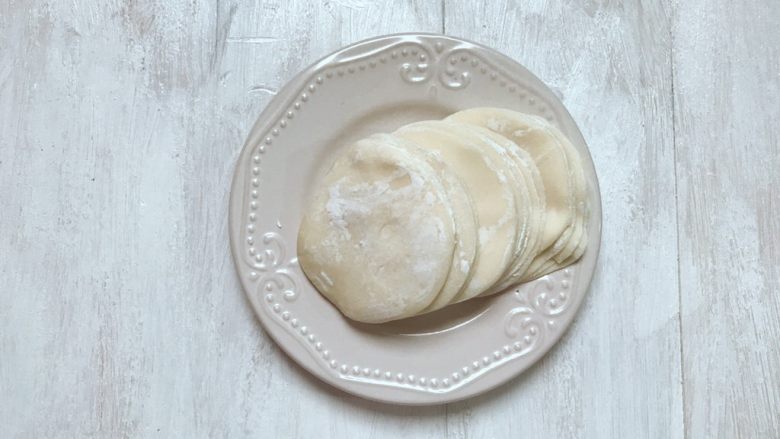 7. 饺子皮用擀面杖稍微擀大一些,左边是擀大了的饺子皮。