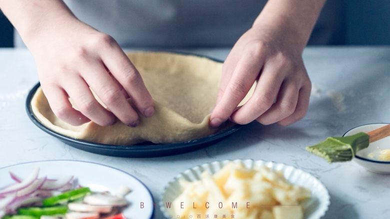 10. 用手慢慢调整面饼与披萨盘贴合后,封上保鲜膜室温发酵15分钟(冬天气温低发酵时间至少需要30分钟);