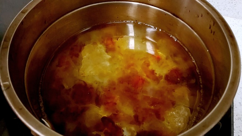 3. 锅里倒入桃胶和清水,按个人口味加入适量冰糖。