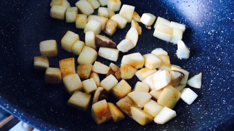 7. 杏鲍菇水份被炒出,表面金黄色,变软。