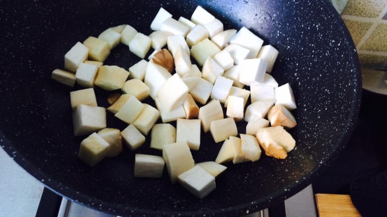 3. 杏鲍菇洗干净,切成大小适中的颗粒。