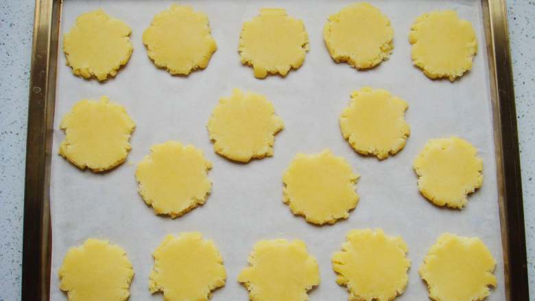 14. 按压在饼胚中间。依次做好。(这个量可以做三大烤盘,共46个桃酥)