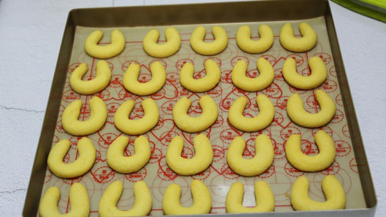 11. 取出面团,分成每个10克的小剂子,用手指交错捏长,然后借助擀面杖搓均匀,弯成内扣的U形