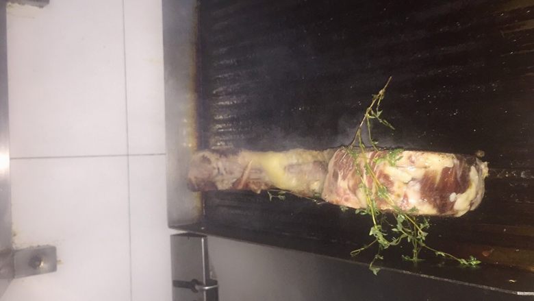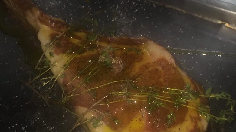 7. 煎制牛排,先煎骨头带油的那一面,逼出牛油,再加入一点橄榄油,用这个油煎牛排