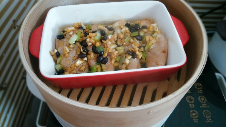 7. 将炒好的豆豉倒在鸡翅上,上锅蒸20分钟