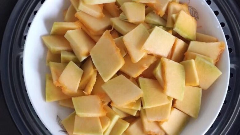 1. 先将南瓜去皮去瓤,洗干净切成薄片,上锅隔水蒸熟。