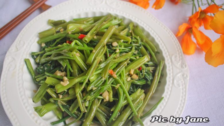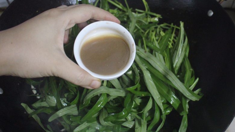 9. 锅里放油,油热后放入一半通菜茎翻炒