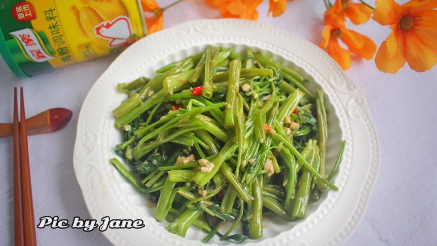 我们广东炒通菜很常见的吃法是腐乳炒,但是还有一种是虾酱炒通菜,也一样好吃!我女儿开始闻见虾酱味,她很抗拒,因为有点腥臭味,不是人人能接受,但是我用来炒通菜,她爱上了这个味道。这道菜里的家乐鸡粉虽然是辅料,但是让成品味道更深一个层次,是我们家里不能少的调味品。