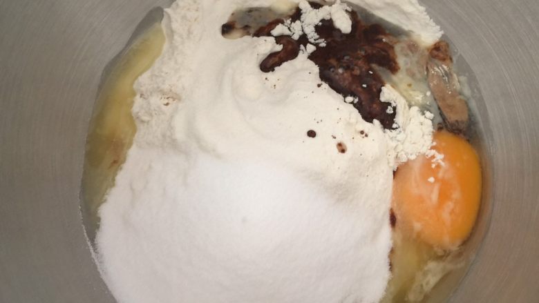 3. 放入鸡蛋、盐、砂糖、水、咖啡液