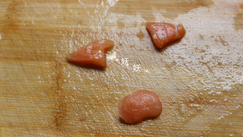 9. 蒸蛋的时间我们把三文鱼切两个三角形和一个椭圆形。蔬菜水果的话也是一样,切出形状就行了。