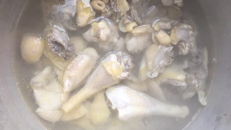 5. 将洗好的鸡倒入锅中,加入水,滴几滴料酒。