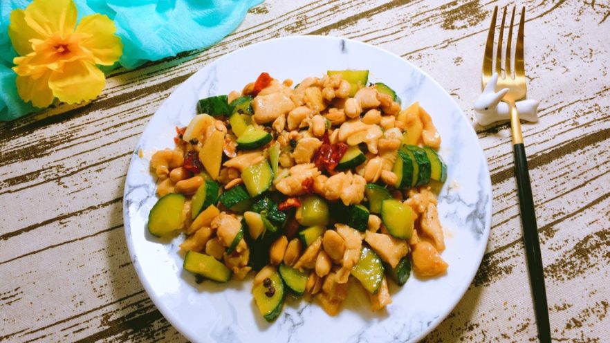 13. 直到鸡胸肉变白就将黄瓜放入爆炒