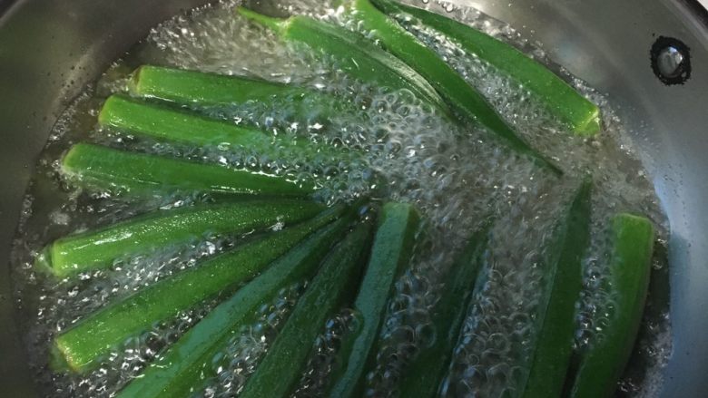 2. 锅里放水烧开至沸腾,放入洗好的秋葵。