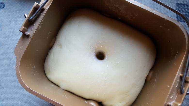 6. 6.揉至完全扩展阶段后,进行基础发酵,发酵结束后,面团体积为原体积的两倍大,中间用手指蘸面粉戳一个洞,不塌陷不回缩即为发酵好了。