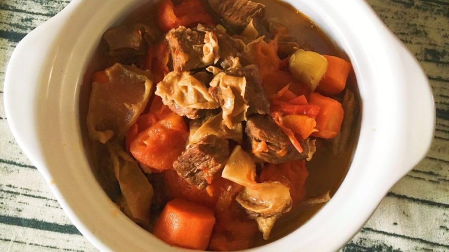 12. 加入切好的西红柿继续熬煮10分钟等西红柿软皮后将牛肉和西红柿轻轻搅拌均匀