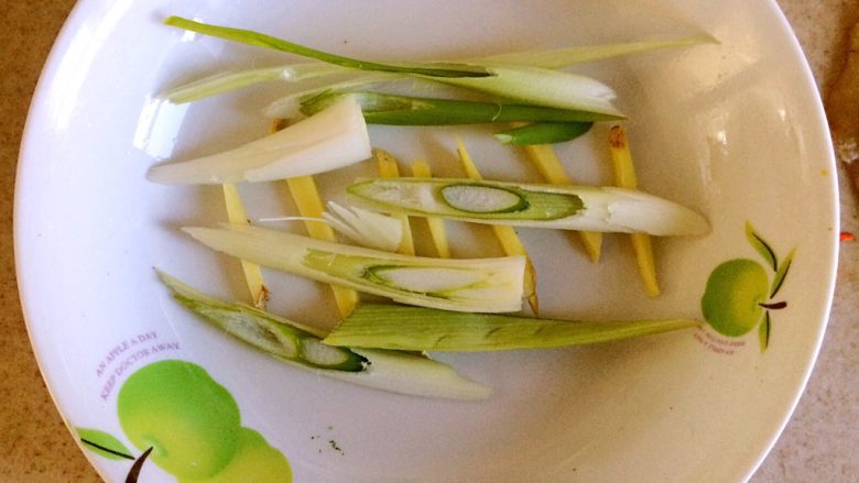 7. 在腌制鳕鱼的时候,另起一个盘子,葱姜切丝,摆放在盘中。