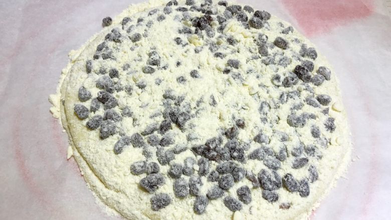 11. 因为面片比较软,提前将其放置于吸油纸上后,再覆盖另一层面片覆盖于第一层上。 同样方法撒上蜜豆后,再撒上提前预留出来的奶酥粒