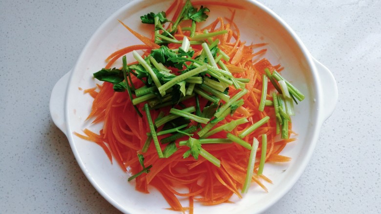 10. 锅中再入少许油,下胡萝卜丝翻炒一下;