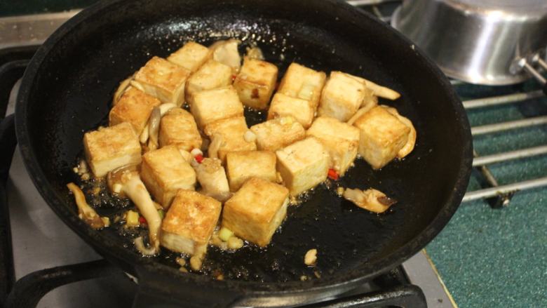 9. 煎好豆腐后,将秀珍姑也放入,稍稍煎出焦色。
