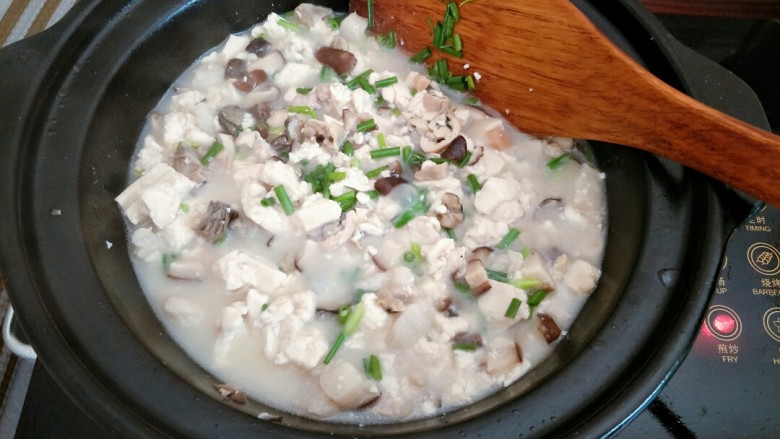 10. 加盐、鸡精调味,淋入水淀粉煮开,出锅前撒入葱花