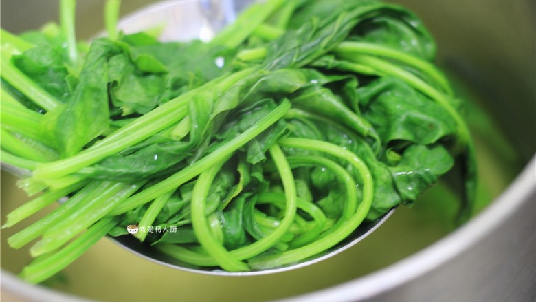 5. 另取一口锅,烧开清水,下菠菜焯15秒,立即关火捞出,过一遍清水,挤去水分