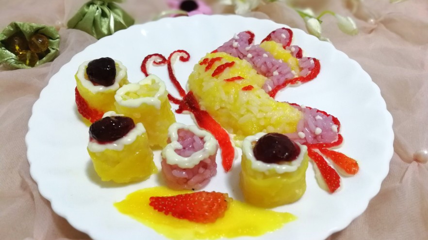 18. 在蝴蝶的翅膀上点上沙拉酱装饰一下完成。米饭也会变甜蜜٩(๛ ˘ ³˘)۶❤