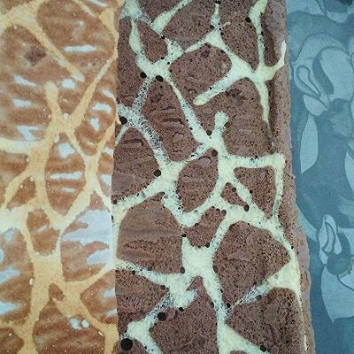 9. 剩下的蛋白糊分两次加入蛋黄糊中切拌均匀,倒入烤好的花纹上,烤制15分钟后取出,撕去油纸晾凉