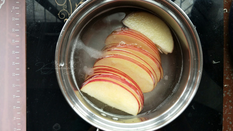 1. 苹果对半切开,去核。切成2mm的薄片。