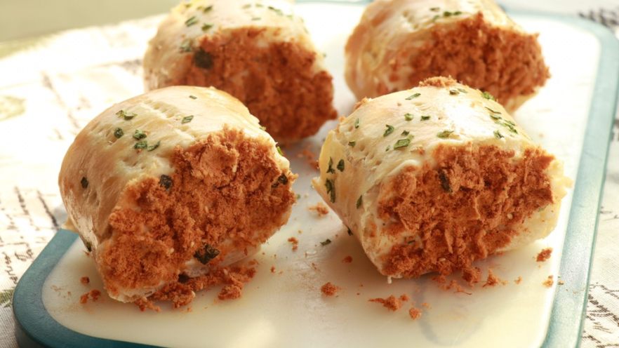 18. 然后切开,切面抹沙拉酱,沾肉松即可