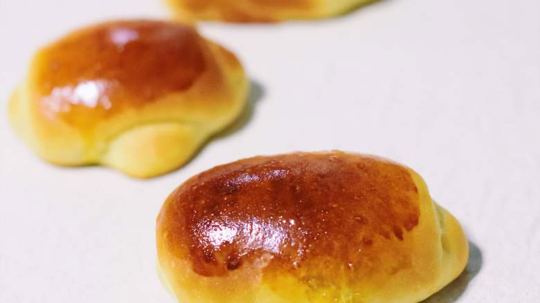 20. 取出面包卷,将刚才剩下的蛋液均匀地刷在面包表面。烤箱预热至220度后,放入面包烤15分钟。