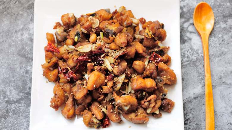 11. 倒入炸好的鸡丁,煸炒半分钟,撒上白芝麻就可以出锅盛盘了。