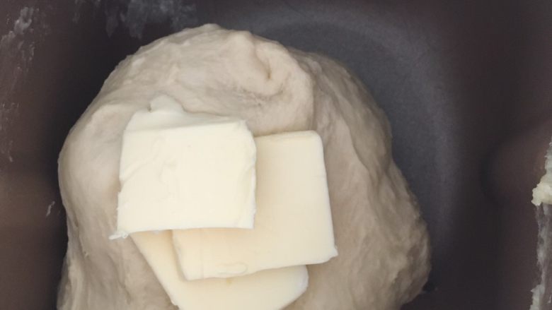 11. 面包机揉面30分钟,在面团上掏个洞把黄油塞好埋入