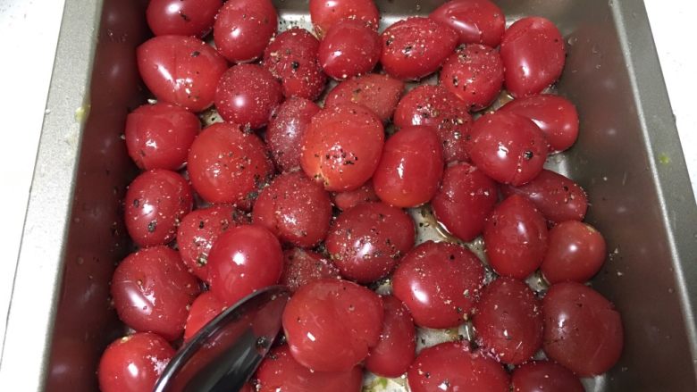 4. 烤箱预热170度,中下层,烤50分钟左右,具体看各自烤箱活力,注意观察小番茄别焦掉