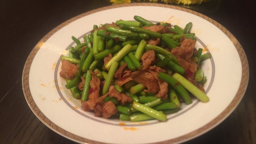 1. 新鲜蒜苔剪下头,去掉老根,洗干净切成段。
