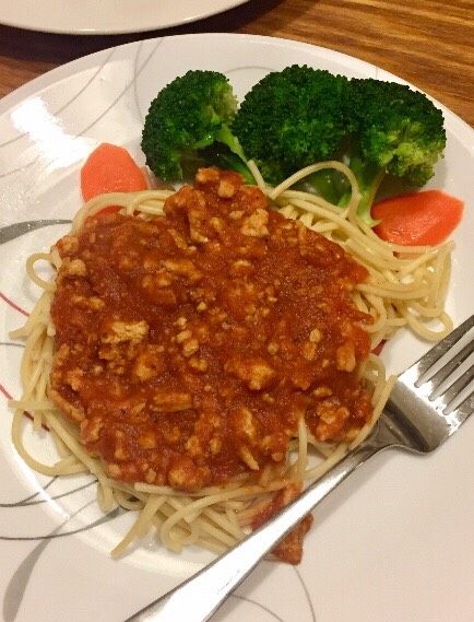 11. 把面条盛入盘中,浇上番茄肉酱,点缀上自己喜欢吃的蔬菜,即可开吃了!
