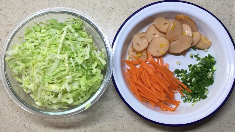 4. 锅里留油,放入包菜,红萝卜炒软。